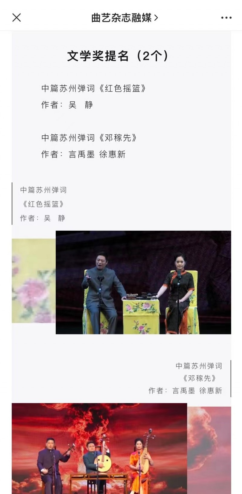 5月30日,第十二届中国曲艺牡丹奖公布了提名名单,由常州市文化艺术研究所编剧言禹墨创作的中篇苏州弹词《邓稼先》获文学奖提名。 中国曲艺牡丹奖是中国曲艺界最高奖,本届设节目奖、表演奖、文学奖、新人奖4个子项,提名者将进入牡丹奖终评。 |