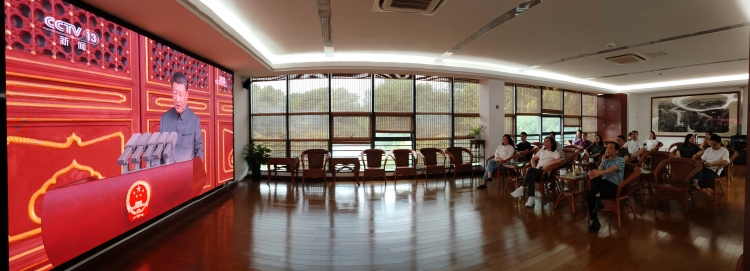 9月3日上午,北京天安门广场旌旗猎猎、气氛庄重,纪念中国人民抗日战争暨世界反法西斯战争胜利 80 周年大会在此隆重举行。伴随着激昂的乐曲与整齐的步伐,盛大阅兵仪式展现着中国维护和平的坚定力量,中共中央总书记、国家主席、中央军委主席习近平发表的重要讲话,更是字字铿锵,激荡着亿万中华儿女的爱国情怀。 与此同时,常州画院二楼会议室内同样沉浸在肃穆而振奋的氛围中,“沉浸式党课忆峥嵘 丹青聚力启新程”主题党建活动现场,全院党员、干部齐聚屏幕前,共同收看大会盛况。大家聚精会神、仔细聆听,时而屏息凝视受阅部队的威武英姿,时而认真记录习近平总书记讲话中的深刻要义,仿佛置身于天安门广场的现场,沉浸式感受着这场跨越时空的精神洗礼。 “这不仅是一次纪念,更是一堂生动的爱国主义党课。”收看结束后,现场交流氛围热烈。大家一致认为,国家以最高规格纪念这一伟大胜利,既向世界彰显了中国铭记历史、缅怀先烈的坚定立场,更传递出珍爱和平、开创未来的强烈信号。 “作为书画工作者,我们要用笔墨传承伟大抗战精神。” 党员干部们纷纷表示,将深入学习领会习近平总书记重要讲话精神,深刻领悟 “两个确立” 的决定性意义,坚决做到 “两个维护”,把观看大会的感动与振奋,转化为推动常州书画事业发展的实际行动。未来将以丹青为媒,创作出更多反映时代精神、凝聚民族力量的精品力作,高质量完成 “十四五” 目标任务,在书写中国式现代化常州文旅答卷的征程中,贡献书画工作者的智慧与担当。