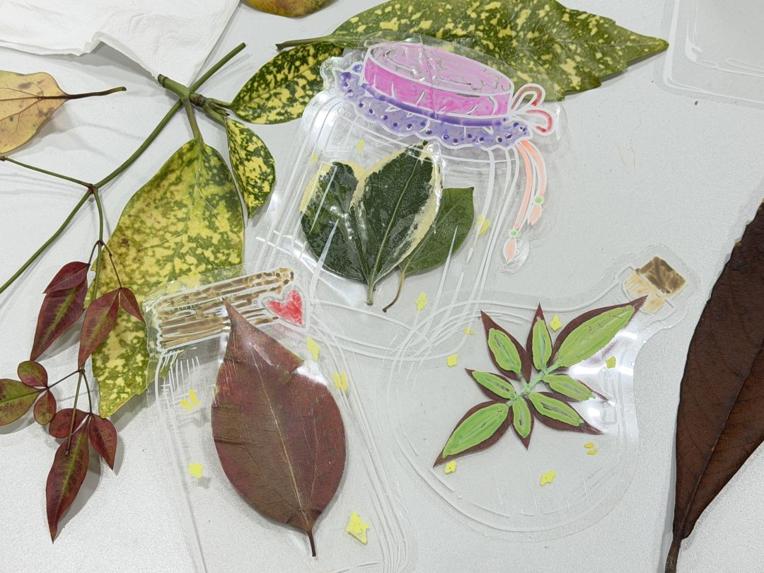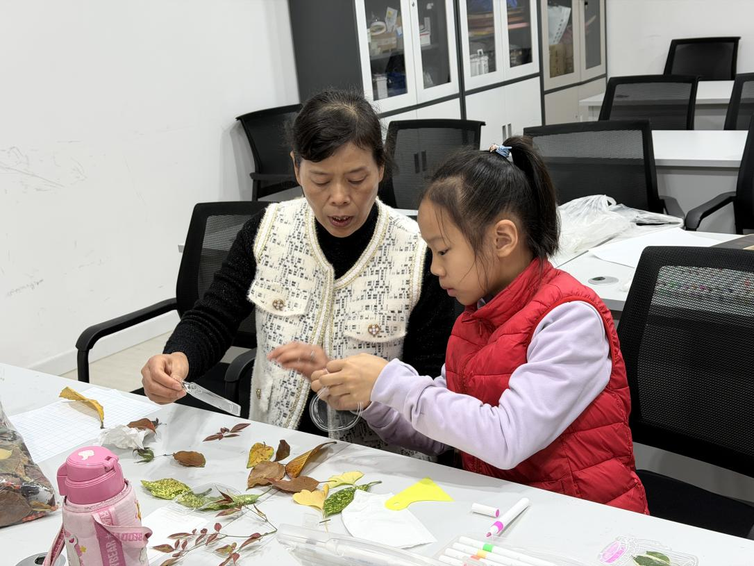 活动现场充满了宁静而专注的艺术氛围。在老师的悉心指导下,参与者们将精心收集的落叶、花瓣作为创作素材,通过巧妙构思、细心拼贴和精细装裱,把一片片形态各异、色彩斑斓的秋叶定格在透明的书签薄膜中。每位参与者都成功将自然的“信笺”转化为永恒的艺术品,孩子们创作出充满童趣的斑斓图案,成年人则更倾向于展现叶片本身的脉络与意境,现场洋溢着创作带来的满足与喜悦。