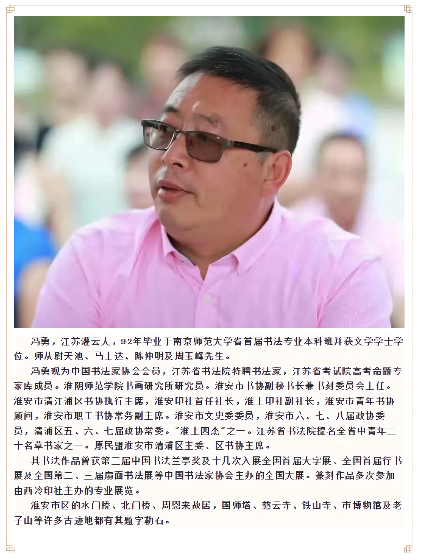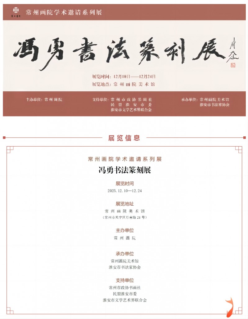 岁在乙巳,时值仲冬,常州画院秉承“艺以载道,文以化人”之旨,特邀书法名家冯勇先生,举办“冯勇书法篆刻展”。斯展也,系本院“学术邀请系列”之重要篇章,亦为构建常州画院学术研究高地之实践。常州画院素以推动书画艺术交流、深化学术研究为己任,此次展览,得常州市政协书画社、民盟淮安市委、淮安市文学艺术界联合会协力共举,诚可谓艺坛盛事,文苑雅集。