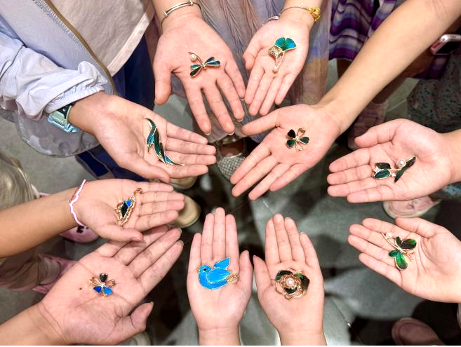 8月23日下午,20组亲子走进瞿秋白故居。老师讲解点翠技艺时,串联瞿秋白革命故事。亲子协作将羽毛镶入金属底座,男孩称成品胸针“像发光的火苗”,这“火苗”恰是先驱点亮的革命星火,也是抗战军民的希望。