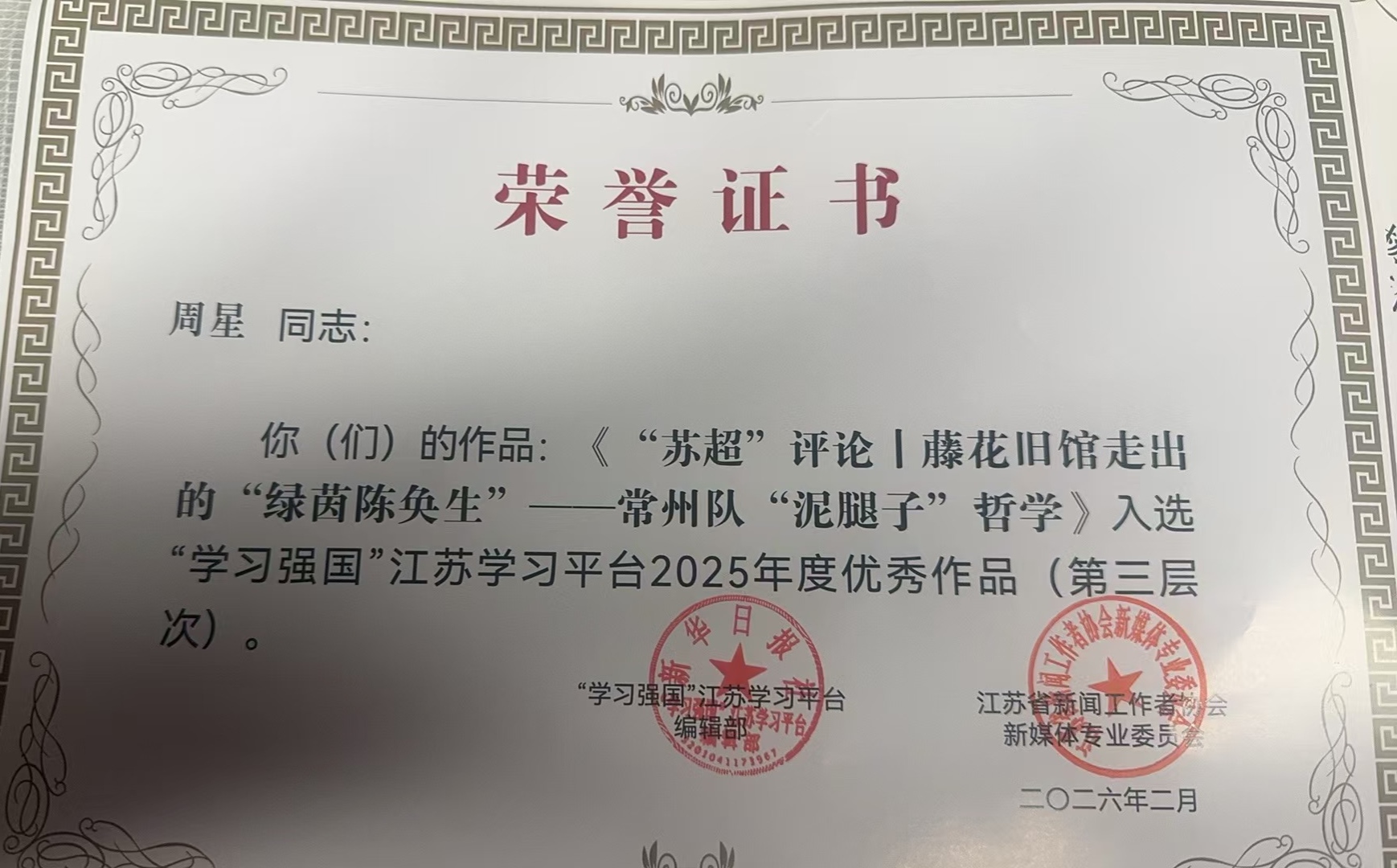 文研所周星的“苏超”评论入选“学习强国”江苏平台优秀作品