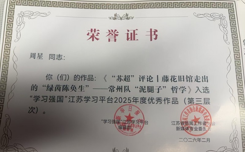 近日,从“学习强国”江苏学习平台传来喜讯,常州市文化艺术研究所周星撰写的《“苏超”评论丨藤花旧馆走出的“绿茵陈奂生”:常州队“泥腿子”哲学》一文,成功入选“学习强国”江苏学习平台优秀作品。这一荣誉不仅是对作者个人创作能力的肯定,更是对常州市文化艺术研究所长期以来深耕文化研究、积极服务地方发展的充分认可。