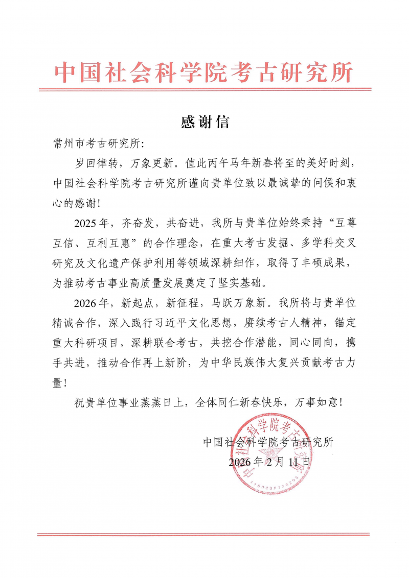 合作期间,双方始终秉持“互尊互信、互利互惠”的合作理念,在重大考古发掘、多学科交叉研究及文化遗产保护利用等领域深耕细作,取得了丰硕成果,为推动考古事业高质量发展奠定了坚实基础。此次致谢不仅是中国社科院考古所对常州考古所专业能力与工作作风的高度认可,更是双方深化考古协作、共护文化根脉的生动写照。